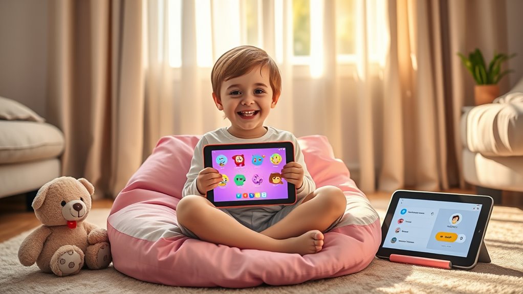 If you’re looking for the best kids’ tablets with strong parental controls in 2025, I can help. I recommend devices like Amazon Fire models with built-in content filtering, app management, and time limits, plus some Android options with customizable controls and expandable storage. Durable cases and kid-friendly features make sure safety and longevity. Keep in mind, the right tablet balances fun, safety, and learning. If you continue, you’ll soon discover the top options to protect and entertain your little one effectively.