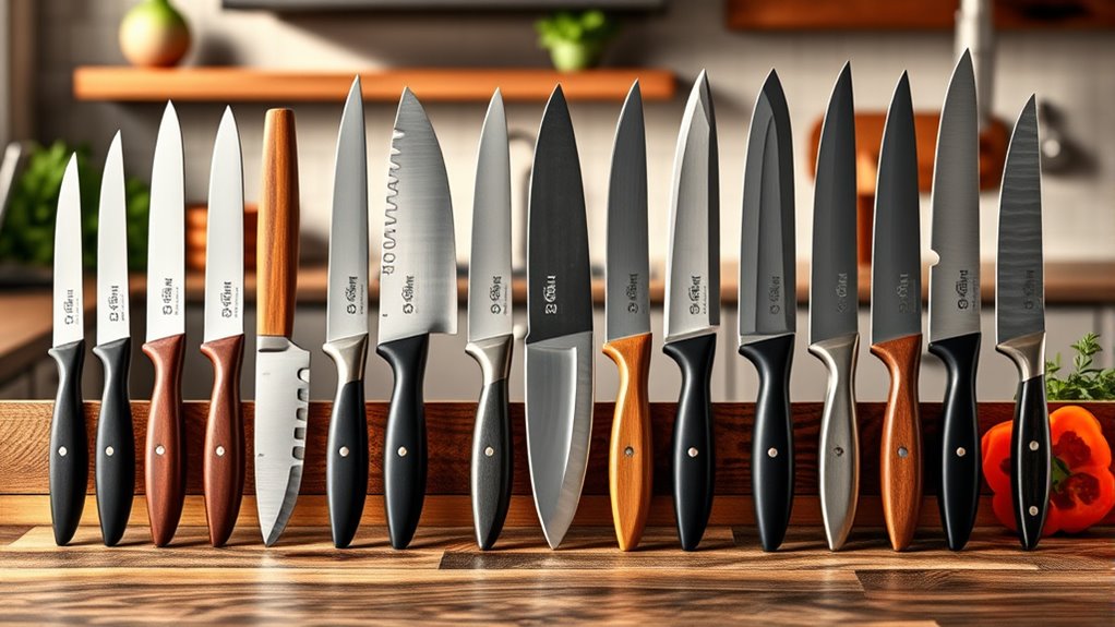 When it comes to kitchen knives, price can range from budget-friendly options to high-end sets costing several hundred dollars. I’ve found that quality materials like high-carbon stainless steel or Damascus steel often justify higher prices because they offer better durability, sharpness, and edge retention. Investing in a complete set or a few versatile, high-performance knives provides better value than buying individual, less capable ones. Features like built-in sharpeners, ergonomic handles, and attractive storage can also add value by reducing maintenance costs and enhancing comfort. To make the best choice, I recommend comparing the cost-to-performance ratio. This way, you get knives that deliver long-lasting performance, comfort, and efficiency without overspending, ensuring you get the most bang for your buck.