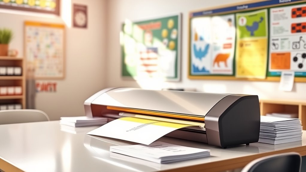 When selecting a laminator for classroom use, durability and ease of maintenance play a key role in guaranteeing it remains reliable over time. A sturdy build with quality materials like high-molecular polymers and metal parts helps it withstand frequent use. Regular maintenance, such as cleaning rollers and quickly clearing paper jams, extends its lifespan and maintains consistent performance. Models with self-cleaning or anti-jam features reduce downtime and prevent damage from debris or misfeeds. Choosing laminators with replaceable parts, like rollers or heating elements, makes repairs easier and prolongs their usability. Additionally, proper storage and following manufacturer guidelines for cleaning and operation can prevent premature wear. These practices ensure your laminator stays functional and efficient throughout the school year.