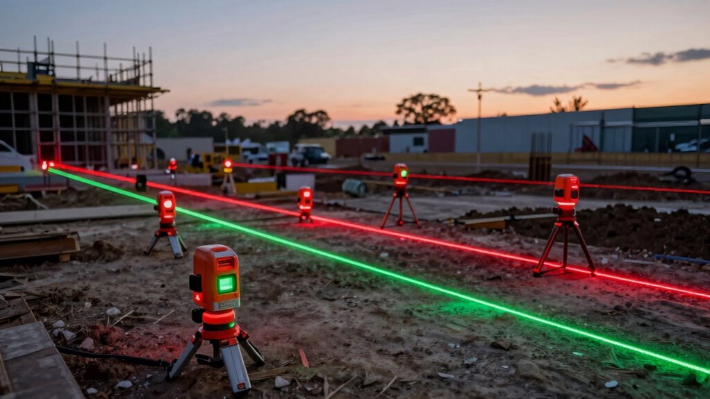 Are you aware of the key features that can boost a laser level’s visibility outdoors? Bright green laser beams are ideal since they’re up to four times more visible in sunlight than red lasers. Look for models with pulse or scan modes, which extend detection range to 200-400 feet when paired with a receiver. High-powered laser diodes, like 110mW, also enhance visibility in bright conditions. Adjustable brightness modes are useful for adapting to changing outdoor lighting and saving battery life. Accessories such as laser glasses and target plates further improve line detection in direct sunlight. These features ensure your laser level remains clear and accurate outdoors, making your work more efficient and precise despite challenging lighting conditions.