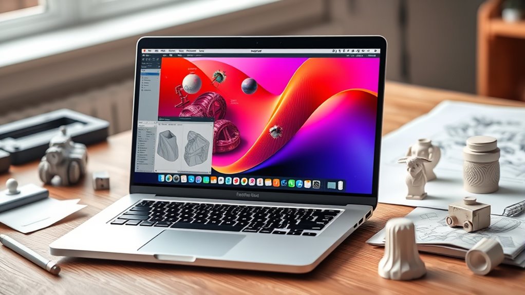 Long battery life is essential for 3D modeling and VFX professionals who need to work uninterrupted during long sessions or on the go. A longer battery allows you to tackle complex projects without constantly searching for an outlet. High-performance MacBook Pros with efficient power management can handle demanding tasks like rendering and simulations while maintaining extended battery life, often up to 18 hours with larger batteries of 72Wh or more. Portability is equally important; lightweight models make it easier to transport between work sites or client meetings. While slim designs enhance ease of use, they shouldn’t sacrifice battery capacity needed for intensive workflows. Striking a balance between power and portability ensures you stay productive, whether working in the studio or on the move.