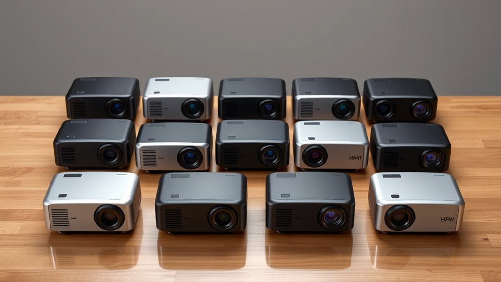 Portability and size are crucial factors to contemplate because they directly influence how easily you can carry and set up your mini projector. Most models weigh between 0.5 to 4.5 pounds, making them perfect for on-the-go use. They typically measure less than 8 inches in any dimension, so they easily fit into bags or pockets. Many compact projectors feature foldable stands or built-in tripods, which simplify setup and enhance flexibility. For outdoor activities, travel, or casual home use, lightweight projectors under 6 inches are especially convenient. However, keep in mind that smaller size can mean fewer features, so finding a balance between portability and functionality is essential. Ultimately, choosing a size that suits your lifestyle ensures a seamless viewing experience wherever you go.