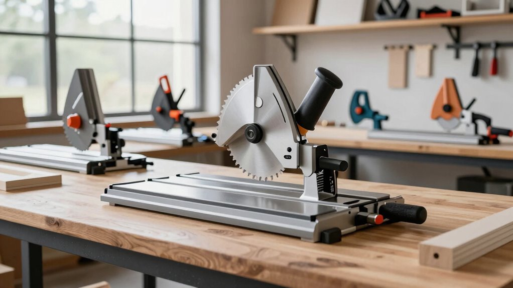 Safety mechanisms are essential features to look for in a miter saw, especially when working with crown molding that requires precise cuts. Blade guards and covers protect your fingers from accidental contact with the spinning blade, reducing injury risk. Electric brakes are a valuable addition, as they quickly stop the blade once you finish a cut, preventing unnecessary accidents. Locking mechanisms on the miter and bevel adjustments ensure the saw stays securely in place during operation, maintaining accuracy. Anti-kickback pawls and riving knives help prevent kickbacks and blade pinching, which can cause dangerous situations. Ergonomic handles and safety triggers promote controlled, steady operation and help reduce user fatigue. Together, these safety features give me confidence to work efficiently while minimizing potential hazards.