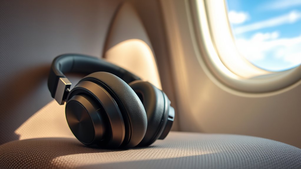 Have you ever wondered how well noise-cancelling headphones can block out the chaos of a busy airport or a noisy train? Effective noise cancellation can reduce ambient sounds by at least 90%, creating a much calmer environment. Hybrid ANC technology is especially impressive—it uses multiple microphones and digital algorithms to cancel both low and mid-frequency noises like engine hums and chatter. The best headphones automatically adjust noise reduction levels based on your surroundings and activity, ensuring ideal performance. Keep in mind, noise cancellation varies across frequency ranges; some headphones excel at blocking low-frequency sounds, such as airplane engines. High-quality ANC not only makes your listening clearer but also reduces fatigue during long journeys, making travel more comfortable and enjoyable.