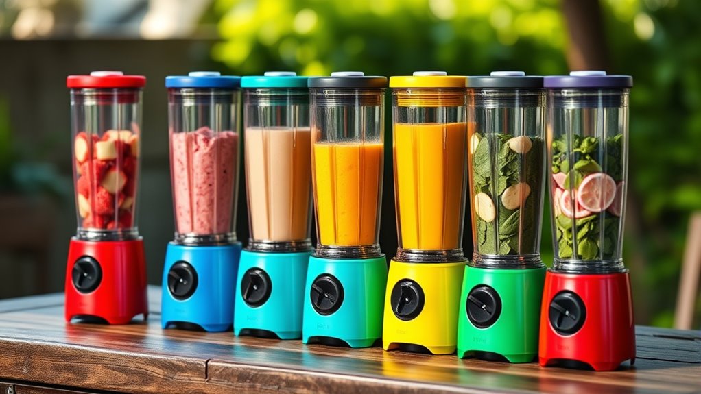 Looking for the best personal size portable blenders to make smoothies on the go? I’ve found options that are lightweight, cordless, and quick to blend, perfect for busy mornings or travel. Many feature USB recharging and BPA-free materials, with powerful motors and stainless steel blades for smooth results. Some come with travel cups and leakproof lids to keep things mess-free. If you want reliable, convenient blenders, keep exploring—I’ll share everything you need to pick the best one for you.