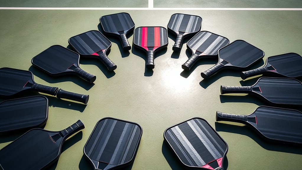 Choosing a graphite pickleball paddle set means considering how resilient the materials are, since this directly impacts how long your paddle will last. Graphite paddles are prized for their high strength-to-weight ratio, making them both sturdy and lightweight. The surface resists chipping and cracking, which helps extend the paddle’s lifespan even with frequent use. Inside, the polymer honeycomb core absorbs shocks and impacts, reducing wear and tear over time. Reinforced edges further protect against chips and delamination, maintaining structural integrity during intense play. Proper maintenance, like avoiding excessive impacts and storing paddles in protective cases, also plays a vital role in longevity. Overall, durable materials ensure your paddle stays in top condition, providing consistent performance game after game.
