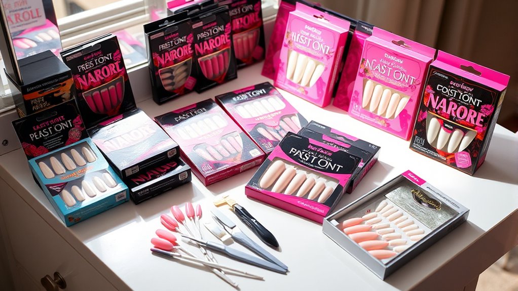 Looking for the best press-on nail kits to make salon-quality manicures at home? I’ve found top options like BTArtboxnails XCOATTIPS, SXC Cosmetics French Tip, Beetles’ extensive sets, and versatile kits with easy application tools. These kits offer high-quality materials, various designs, and long-lasting wear, perfect for DIY enthusiasts. If you want tips on how to choose the right one and get professional results, keep exploring—there’s more to discover!