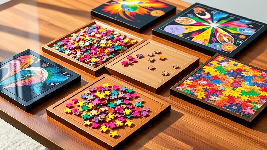 To prevent puzzle pieces from falling off, I make sure to work on a sturdy, non-slip surface. I also keep the edges of the board slightly raised or use a puzzle mat with sides that hold pieces in place. When moving sections, I gently lift and support them. Using a puzzle tray or mat helps contain pieces, so they don’t spill off, keeping my workspace neat and frustration-free.