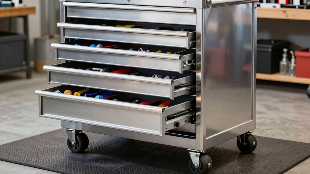 Did you know that most casters are tested to support at least 500 pounds? I’ve found that many rolling tool chests come with casters designed for uneven surfaces, providing better stability and mobility. They often feature larger, rubberized wheels that adapt to bumps and rough terrain. So, if you’re worried about uneven floors, these casters are generally a good choice to keep your tools easily accessible and secure.
