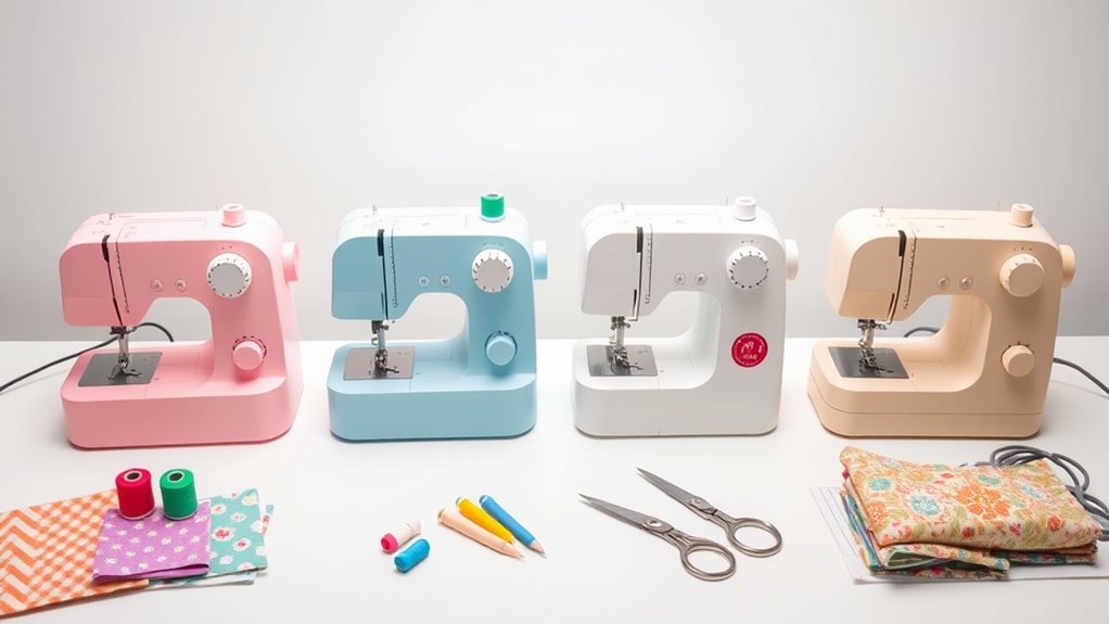 A variety of stitch options can considerably expand what you can do with your sewing machine. With multiple stitches like straight, zigzag, decorative, and buttonholes, I can explore different techniques and projects without switching machines. Most beginner models offer between 12 to 37 built-in stitches, giving enough versatility for basic repairs, garment making, quilting, and decorative sewing. Some machines even include automatic stitch selection or printed diagrams, making it easier to choose the right stitch quickly. Having a good range of options helps build confidence as I experiment with different fabrics and styles. It’s reassuring to know I can handle various tasks with a single machine, making my sewing journey more creative and enjoyable.