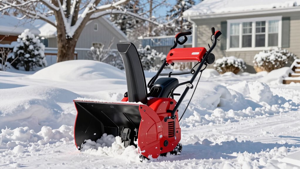 Maneuverability and control are crucial factors in selecting a snow blower capable of handling heavy snow efficiently. An adjustable chute control helps me direct snow precisely, making it easier to navigate around obstacles. A lightweight design reduces fatigue and improves handling, especially over large areas. Power-assisted or self-propelled models with variable speeds give me better control and ease of movement through deep snow. Large, durable wheels with good traction are essential for stability on icy or uneven surfaces. Ergonomic handles and intuitive controls make steering and operation smoother, minimizing strain. When choosing a snow blower, I look for these features to ensure I can move quickly and confidently, even in challenging conditions, without sacrificing control or comfort.
