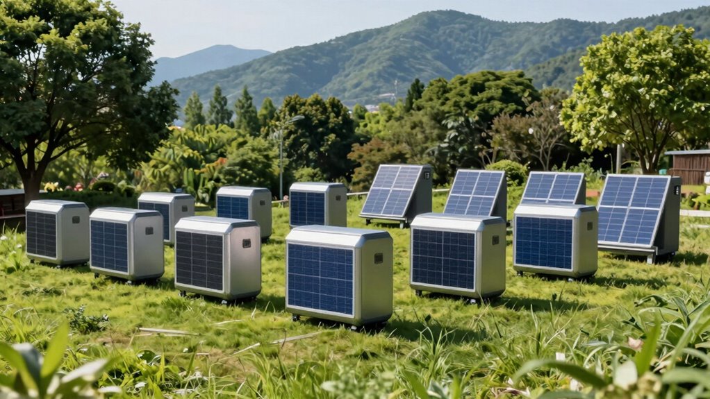 Considering expandability options is vital when selecting a solar generator, especially if you anticipate needing more power in the future. Many models support adding extra batteries or modules, which can considerably increase capacity—sometimes doubling or tripling your initial power. Modular systems let you customize your setup for specific needs, whether for emergency backup or extended off-grid use. Look for generators with compatible connectors or ecosystems that support stacking or cascading units, guaranteeing seamless expansion. It’s also imperative to check the maximum expandable capacity so you know how much your system can grow. Ease of connecting additional batteries is key; a straightforward process saves time and effort. Prioritizing these features helps guarantee your solar generator remains adaptable as your energy demands evolve.
