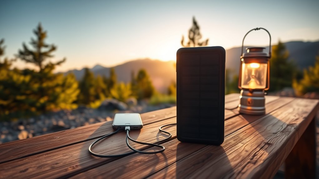 Durability and waterproofing are vital factors to take into account because outdoor conditions can be unpredictable and tough on electronic devices. A solar power bank with an IPX4 or higher rating can handle rain, splashes, and moisture, guaranteeing it stays functional in wet environments. Rugged casings made from materials like ABS or silicone protect against dirt, dust, and debris, preventing damage during rough handling. Shockproof or drop-resistant designs are indispensable for surviving accidental falls or impacts on uneven terrain. Sealed ports with protective covers or plugs prevent water and dirt ingress, maintaining the device’s integrity. Reinforced corners or rubber bumpers further boost durability, helping your power bank withstand the rigors of camping adventures. Choosing a model with these features ensures your device remains reliable off the grid.