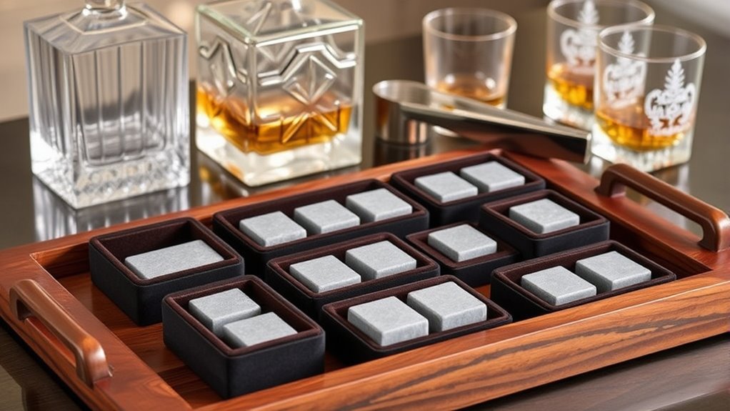 High-quality whiskey stones are typically crafted from materials like soapstone, stainless steel, or granite. Soapstone is popular for its natural, smooth feel and excellent heat retention, enhancing your sipping experience. Stainless steel stones offer a sleek, modern look and are very durable. Granite stones combine natural beauty with sturdiness. These materials guarantee your drink stays perfectly chilled without diluting, making your whiskey moment truly special.