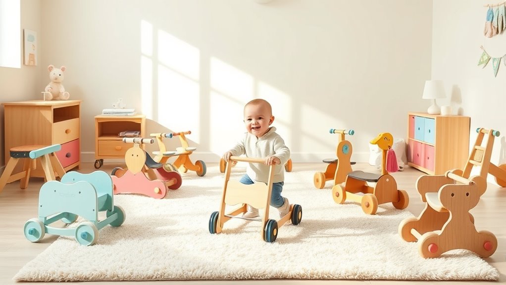 If you’re looking for the best wooden baby walkers and push toys, you’ll find options that promote early walking, motor skills, and imaginative play, all made from safe, eco-friendly materials. Many models feature adjustable heights, activity centers, and stable designs to grow with your little one. The right choice depends on your child’s age, safety needs, and preferences. Keep exploring, and you’ll discover more tips to pick the perfect toy for your baby’s active adventures.