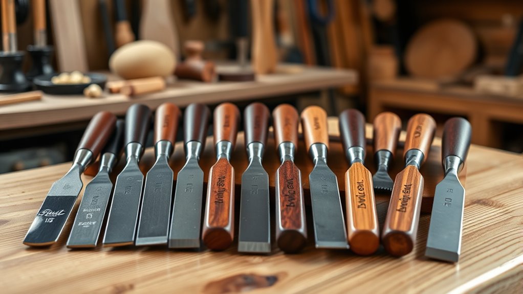 I’ve tested and used many woodworking chisels, and I recommend a mix of high-quality sets like the ENERTWIST 13-piece, REXBETI 10-piece, and DeWalt’s 3- or 4-piece sets for precision and durability. Look for blades crafted from heat-treated steel, comfortable ergonomic handles, and versatile sizes to suit different tasks. If you keep exploring, I’ll guide you through the top picks for 2025 that every woodworker swears by.